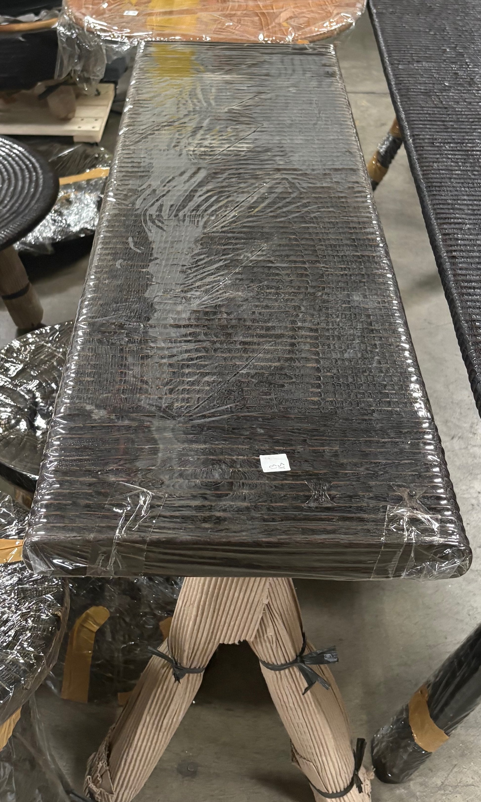 A compact island-inspired console table with black ribbed detailing. Its streamlined silhouette makes it the perfect entryway statement or versatile accent piece, blending rustic craftsmanship with modern design.